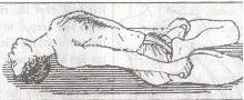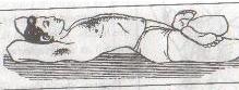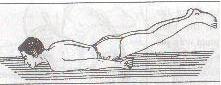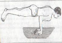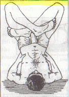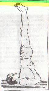 a) Lie down on your back. Gradually raise the entire body and keep it straight ,resting its weight on your shoulders. The chin must be in contact with the chest.Support both sides of your trunk with your hands.The toes must remain together:the eyes must be directed at the toes. | ![]() |