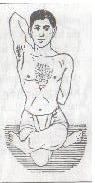5)VIIRASANA (viira posture): Kneel down and sit on the heels.Bend the toes downwards.Rest the back of the hands on the thighs,the fingers pointing towards the groin.Direct the vision at the tip of the nose.The acarya will give directions as to the duration of this asana. |