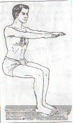 18)SAHAJAUTKASANA (simple chair posture): Seat yourself as if in a chair .Keep the arms straight to conform to the arms of the chair.Duration-half a minute. Practice four times. |